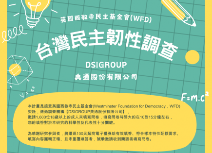 「台灣民主韌性調查」是接受英國西敏寺民主基金會(Westminster Foundation for Democracy,WFD。https://www.wfd.org)委託,由調查機構【DSIGROUP典通股份有限公司】所執行的問卷調查,這個調查的主要目的是為了瞭解台灣民眾對於民主的態度看法。